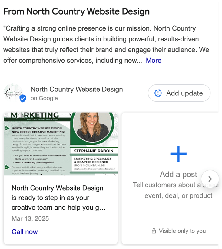 If North Country Website Design created your website, then it is very likely that we set up your Google Business Listing already, however if your listing has not yet been set up, VISIT HERE for full step-by-step instructions. You will need a Google account.